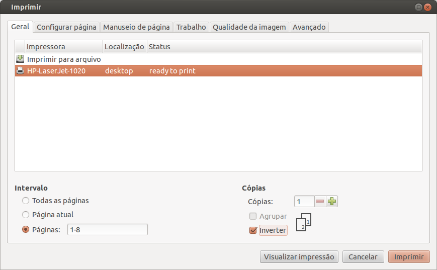 2) Na tela de selecionar o que imprimir, escolha as páginas “1-8”, ou seja, 1 a 8. Com isso você vai ter uma amostragem boa para ver se está dando certo. Marque o campo “Inverter” (confie!).