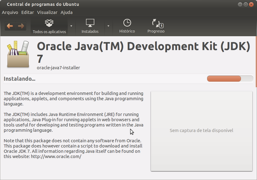 Pronto, agora você vai ver o Oracle Java (TM) Development Kit (JDK) 7. Na realidade, precisaríamos só do JRE (Java Runtime Engine), mas isso é o que temos. O JDK é o Java para quem escreve programas em Java. O JRE é o Java para quem roda programas (e sites) que usam Java, então ele é bem menor. Como não encontrei um JRE que possa ser instalado dessa forma, vamos de JDK mesmo.