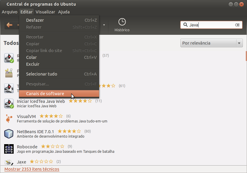 Agora você já pode voltar à Central de Programas do Ubuntu e procurar o Java de novo. Ele é um “item técnico” (um programa usado por outros programas), então você tem que clicar no link abaixo da janela: “Mostrar XX itens técnicos”.