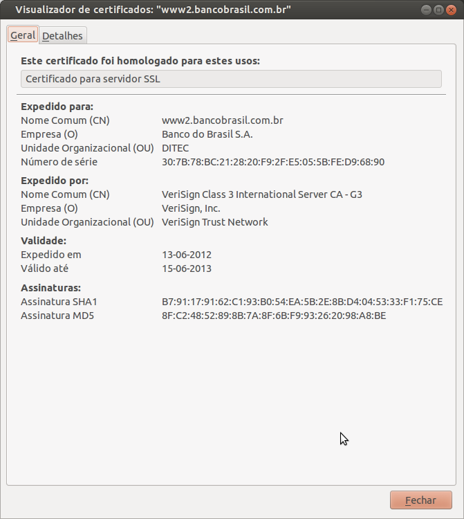 Clicando em “Exibir certificado” você pode ver mais detalhes sobre o certificado. Se tiver curiosidade, pode aprender um bocado sobre o processo de certificação digital, que é muito interessante. Se não tiver curiosidade, basta saber que o site foi certificado como pertencendo realmente à empresa Banco do Brasil S.A. e que esse certificado foi emitido por uma empresa de renome.