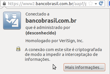 Quais são as brechas de segurança que existem entre você e o Internet Banking? O maior perigo que eu vejo é a possibilidade de interceptação dos seus dados bancários. Quais são as proteções contra isso? Criptografia e certificação digital. Como saber se estas proteções estão sendo aplicadas? Veja as informações apresentadas no ícone de cadeado do Firefox. Vou tentar explicar algumas delas.