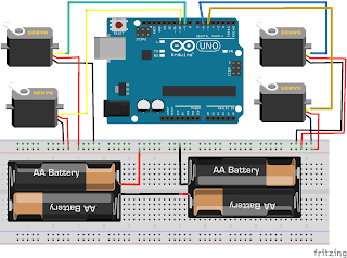 Para fazer isso tudo funcionar, vocês precisam conectar todos os componentes de forma que o controlador do Arduino consiga dizer a todos os motores como e quando se mexer. Eu usei servo motores, que são motores muito usados em aeromodelismo. Em um motor comum, enquanto houver energia, haverá movimento. Um servo motor pode ser controlado para se mover de forma mais específica. Você pode dizer em que posição ele deve ficar. No caso do meu robô, eu digo para cada perna ficar 90° em relação ao chão e depois vou dizendo para cada uma delas ficar paralela ao chão e depois perpendicular de novo, movimentando o robô.