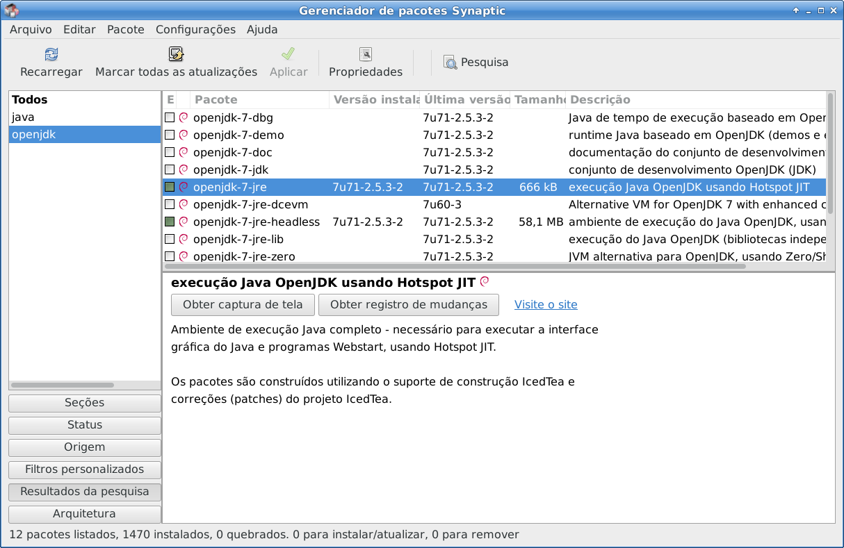 Vá em Menu de aplicativos -> Sistema -> Gerenciador de pacotes Synaptic e Pesquise “openjdk”. A pesquisa vai encontrar dezenas de pacotes, mas o que queremos é o que tem “jre” (Java runtime engine) e mais nada. No meu caso, encontrei o openjdk-7-jre.